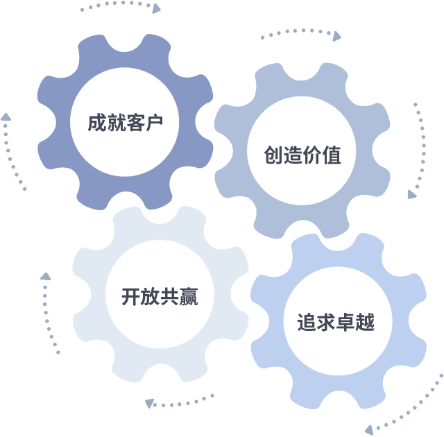 成就客户是一切决策的出发点,,,,创造价值是衡量所有工作的标准,,,,追求卓越是我们做事做人的态度,,,开放共赢是我们的格局也是最终的结果。。。价值观的齿轮环环相扣,,推动着组织里的每个人不断向前。。。