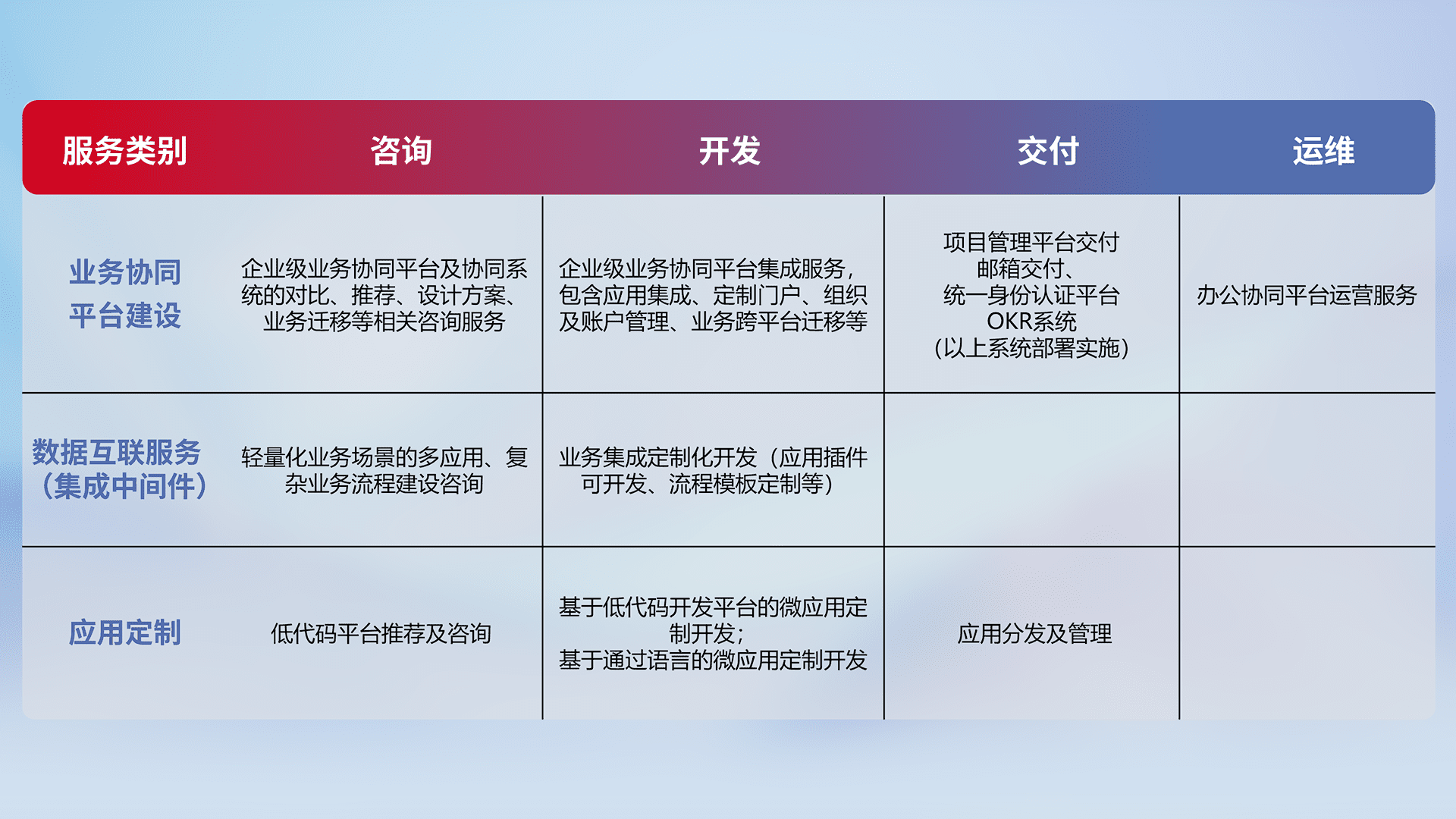 针对钉钉、、、、企微、、、、IDaas等平台级产品提供产品的规划、、、方案、、、、交付、、、定制化开发等服务,,,实现如统一协同办公、、、、智能客户服务、、、、混合会议管理、、、智能数据查询、、、、等业务场景,,实现数字化转型。。